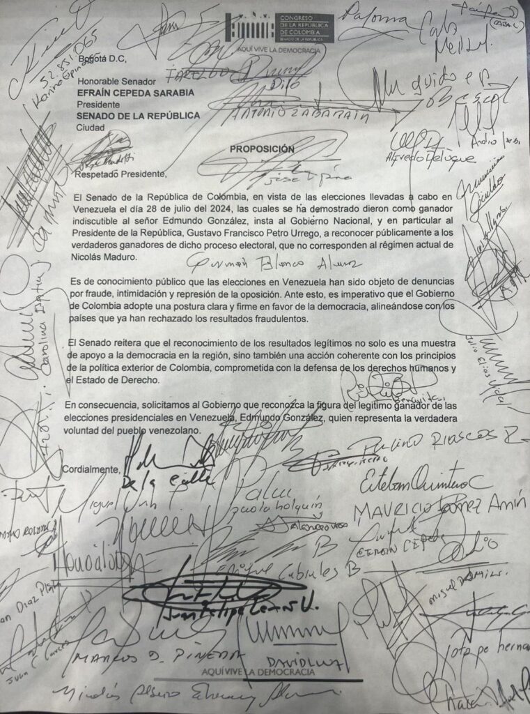 Este jueves 25 de septiembre María Corina Machado, Líder opositora de la coalición Vente Venezuela, por medio de su rede sociales compartió un acta firmada por el Senado de la República de Colombia, liderado por el presidente del Senado Efraín Cepeda, que en repetitivas ocasiones ha demostrado su solidaridad a el vecino país. En el documento además se le exige al presidente de Colombia, Gustavo Petro, que reconozca la victoria legitima de Edmundo Gonzáles Urrutia. “El senado de la República de Colombia, en vistas de las elecciones llevadas a cabo en Venezuela el día 28 de julio del 2024, la cuales se ha demostrado dieron como ganador indiscutible a el señor Edmundo Gonzáles, insta al Gobierno Nacional, y en particular al presidente de la República, Gustavo Francisco Petro Urrego, a reconocer públicamente a los verdaderos ganadores de dicho proceso electoral, que no corresponden al régimen actual de Nicolás Maduro”, señala el documento.
