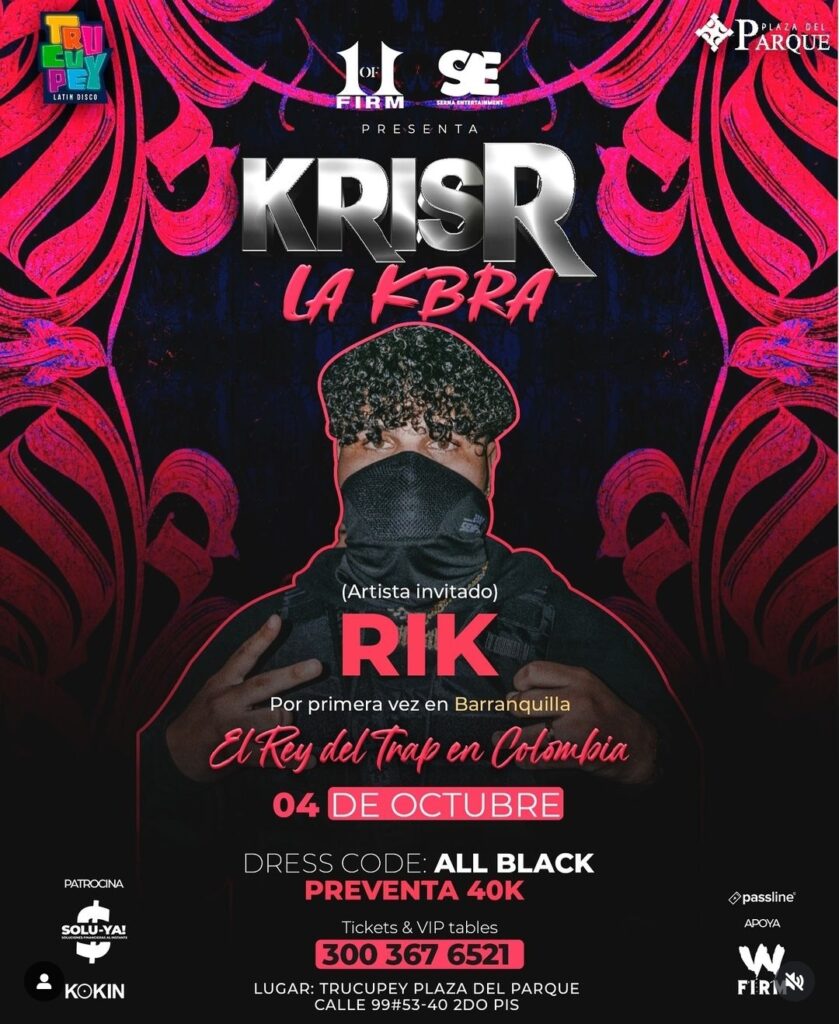 Desde Medellín llega la sensación del trap urbano, Kris R, quien estará acompañado por artistas emergentes del género como Rik, Daza y Ferro, haciendo que Trucupey Plaza del Parque viva una noche espectacular. El artista, que acaba de lanzar dos sencillos: Polos Opuestos, de su autoría, y Piponas Remix junto al artista urbano Blessd «El Bendito», busca, de la mano del streamer Westcol, impulsar a nuevos talentos en el departamento de Antioquia.A partir de las 9:00 p. m., todos los fanáticos y seguidores de Kris R podrán acercarse a Trucupey para disfrutar de este espectáculo lleno de música urbana y rap.