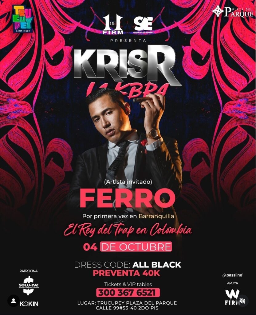Por último, Ferro, otro emergente barranquillero, busca dejar su legado en la música urbana con las últimas tendencias en rimas, utilizando el rap para contar historias valiosas.A través de sus redes sociales, Kris R invitó a todos sus seguidores a no perderse este evento, con el cual dará inicio a su nueva gira nacional.